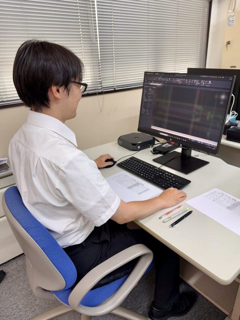 入社当初は右も左も分からず、上司や先輩の指示を受けながら作業を進めていましたが、今では図面作成を一人で行っています。最初は時間がかかっていた作業も、経験を積む中で効率的に進められるようになり、ミスも徐々に減っていきました。